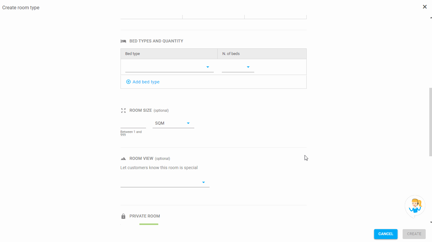 In the Rooms & Rates section, click on “Create new” and then “Create room type”. Name the room and set the maximum occupancy. In the advanced options, you can set the occupancy for children and infants as well.