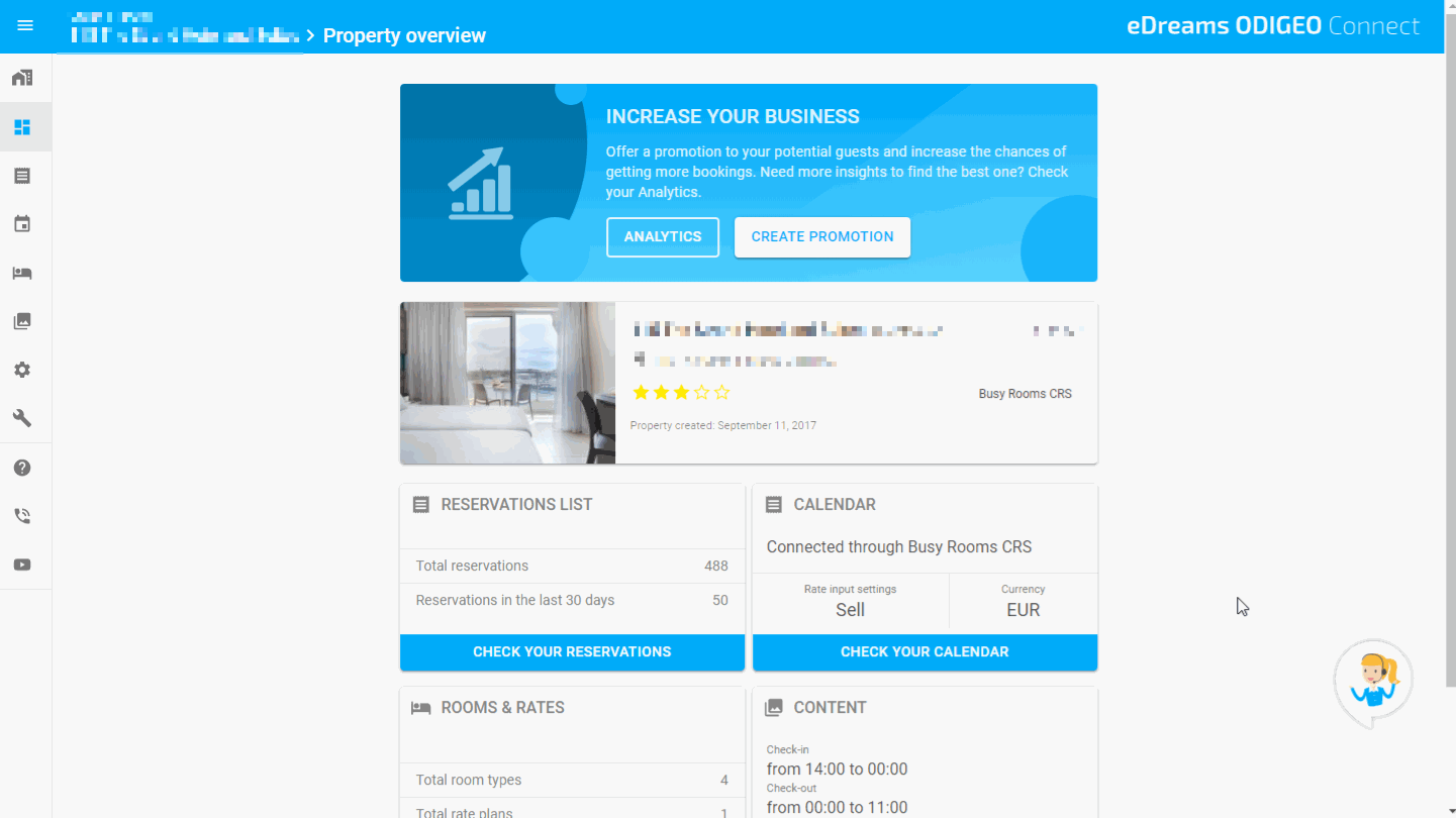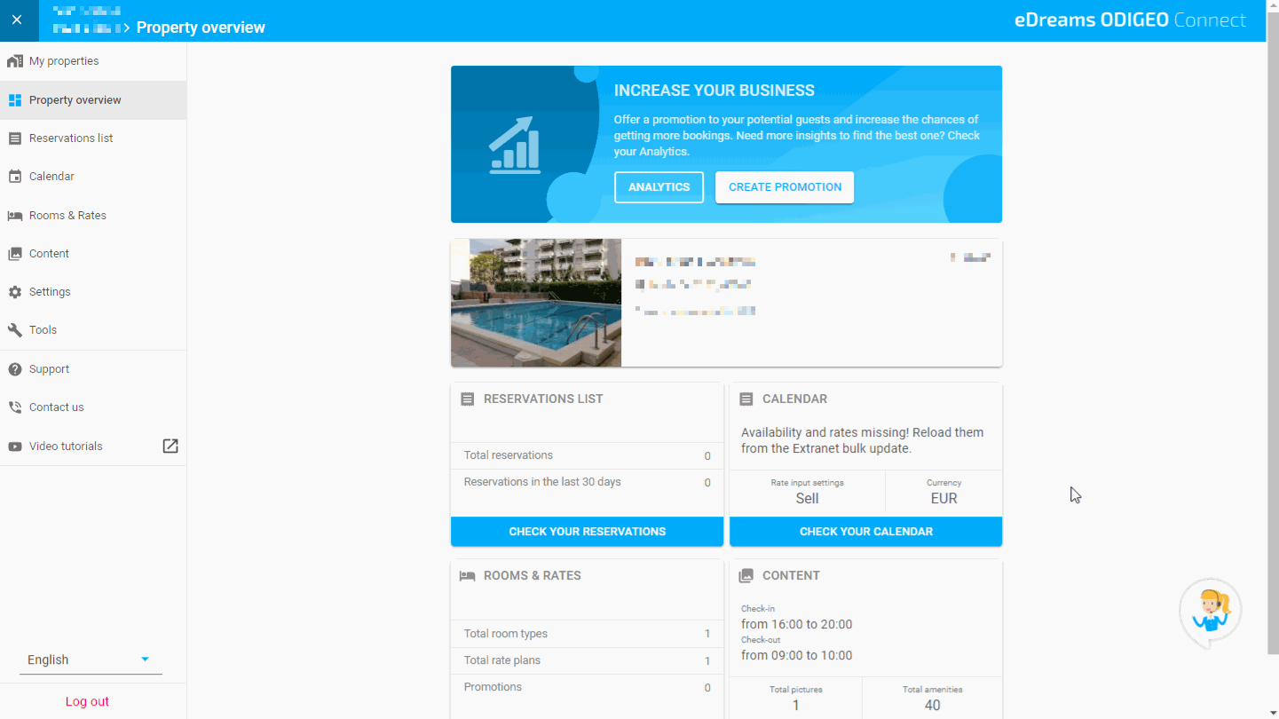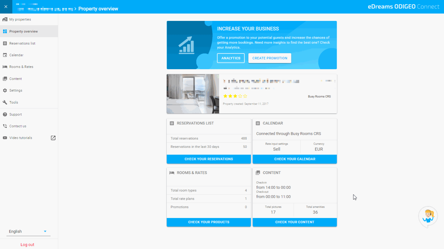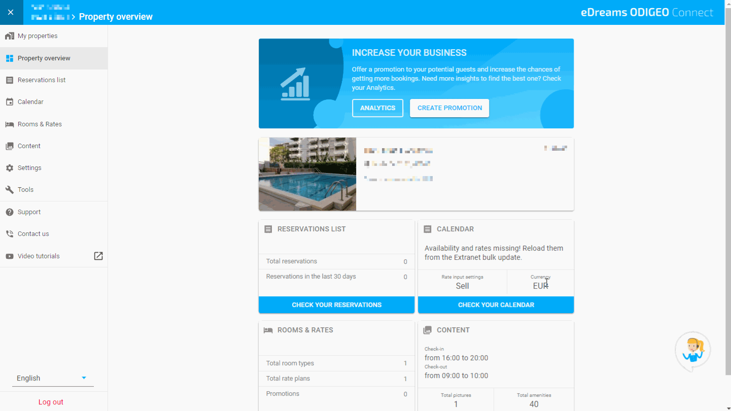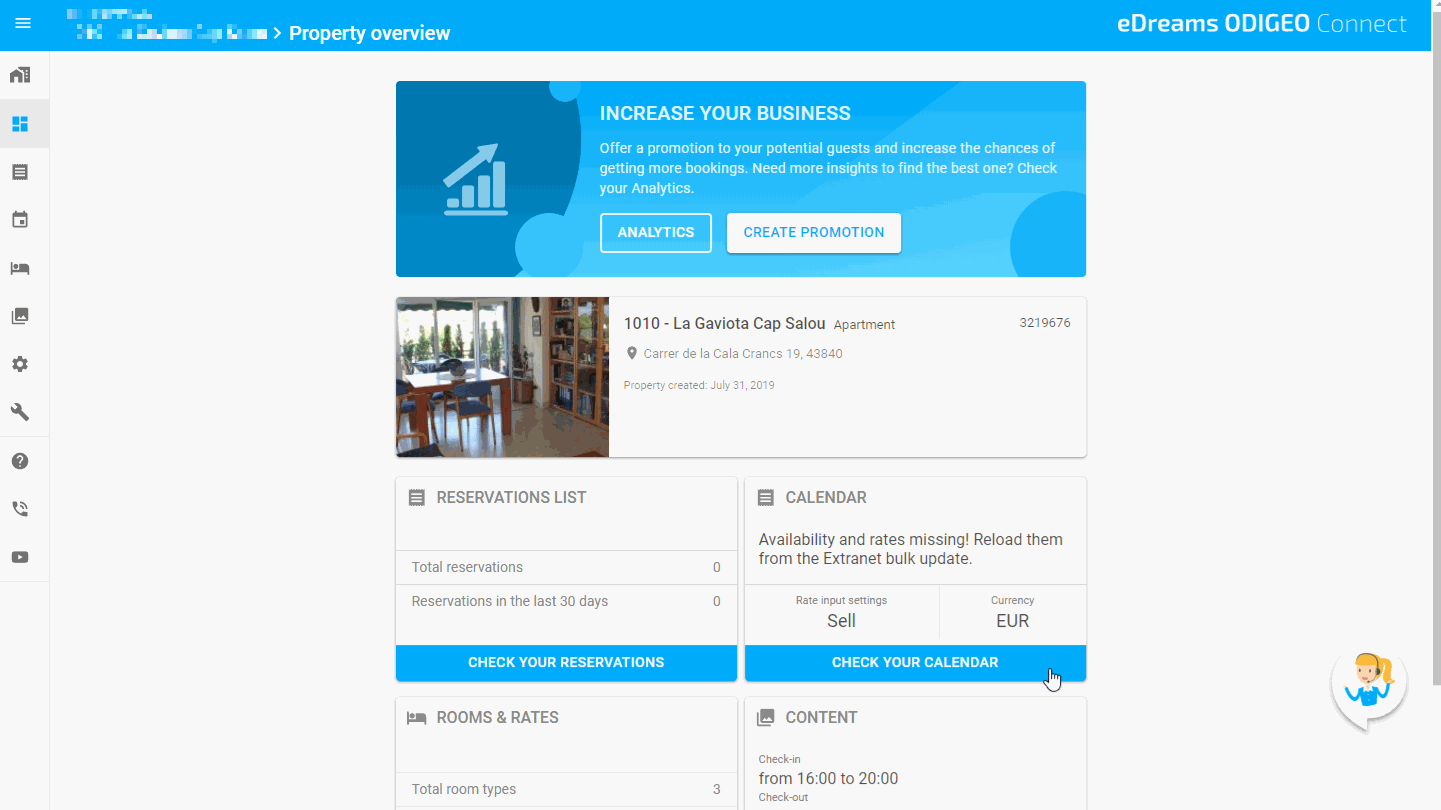 The property overview is a dashboard where you can see your property’s information at a glance and access the main features easily. You can see a summary of your reservations, calendar, room types, rate plans, promotions and content. You have also quick access to create a promotion and check your analytics.