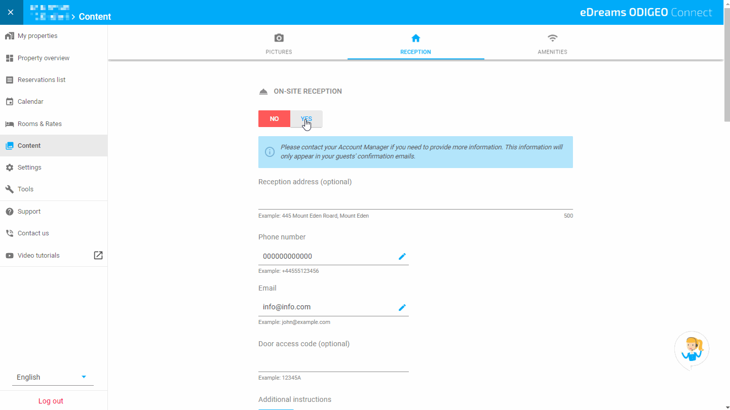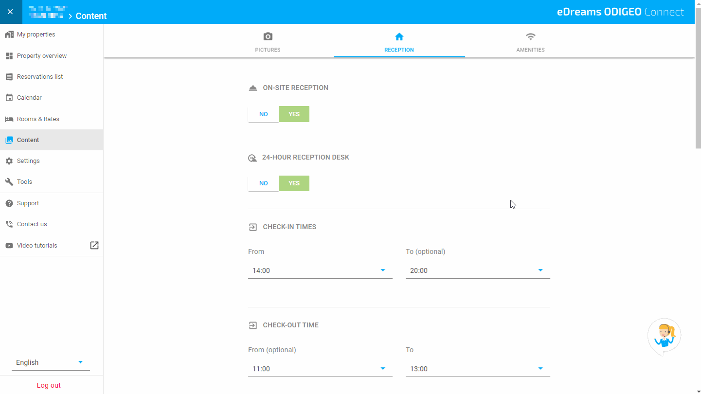 In the Content section, click on the Amenities tab and you will be able to select all the amenities and services that your property offers. This is particularly useful when guests filter their search. Be sure to show up!