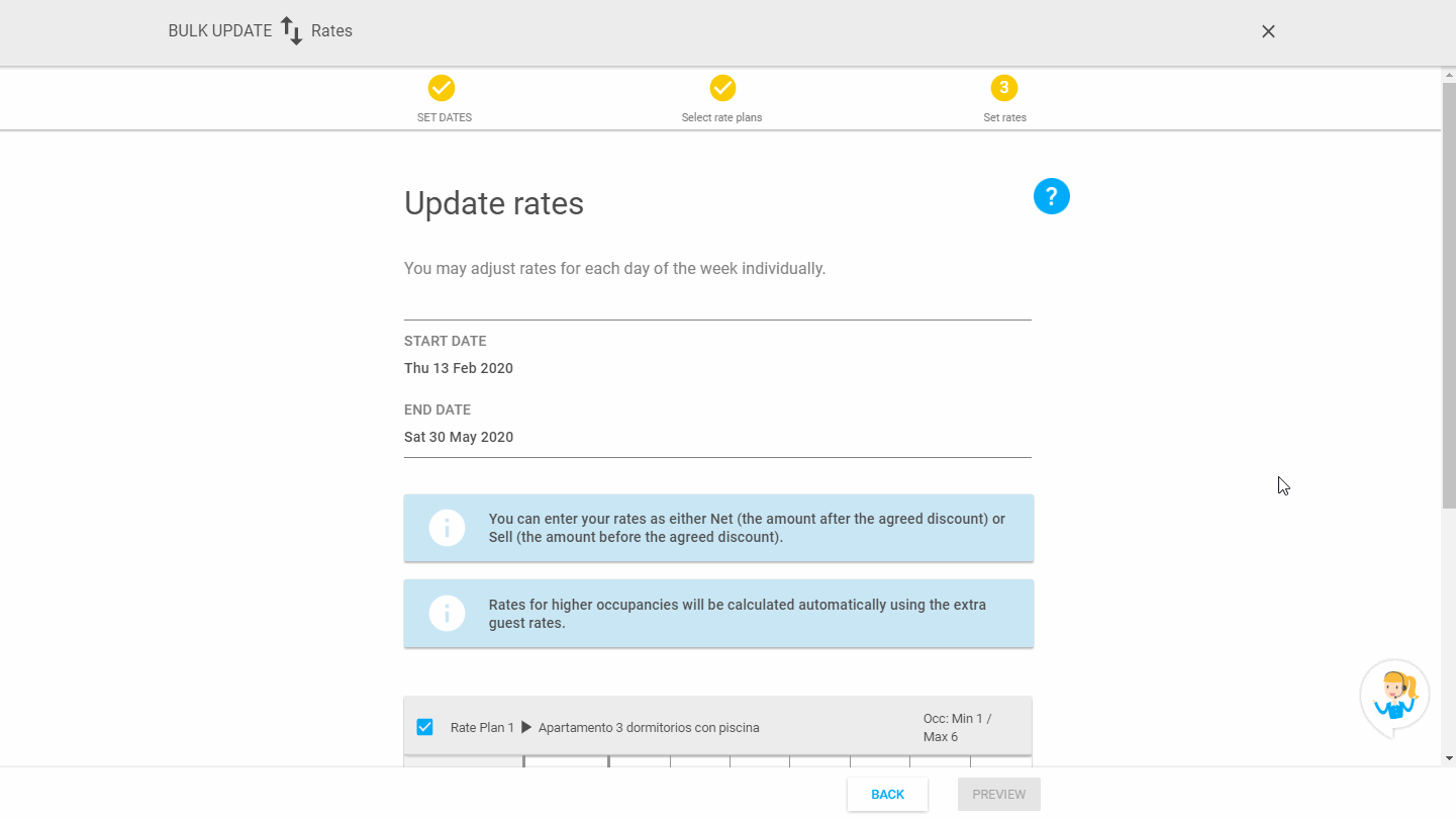 Enter the price per room to update. You can update rates for an entire range or select specific days of the week. Update after previewing the information. Your calendar will be updated with the rates that you entered.