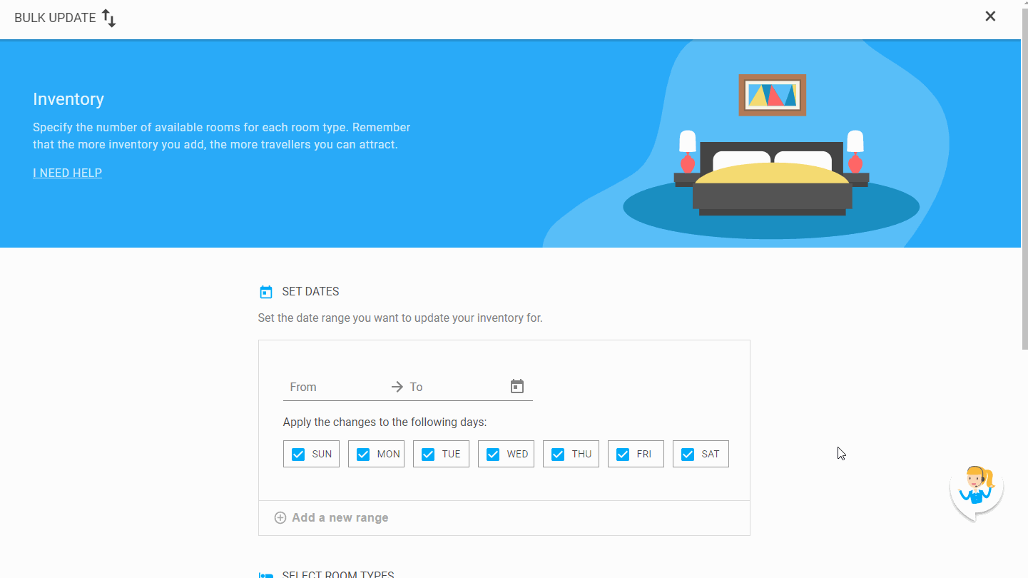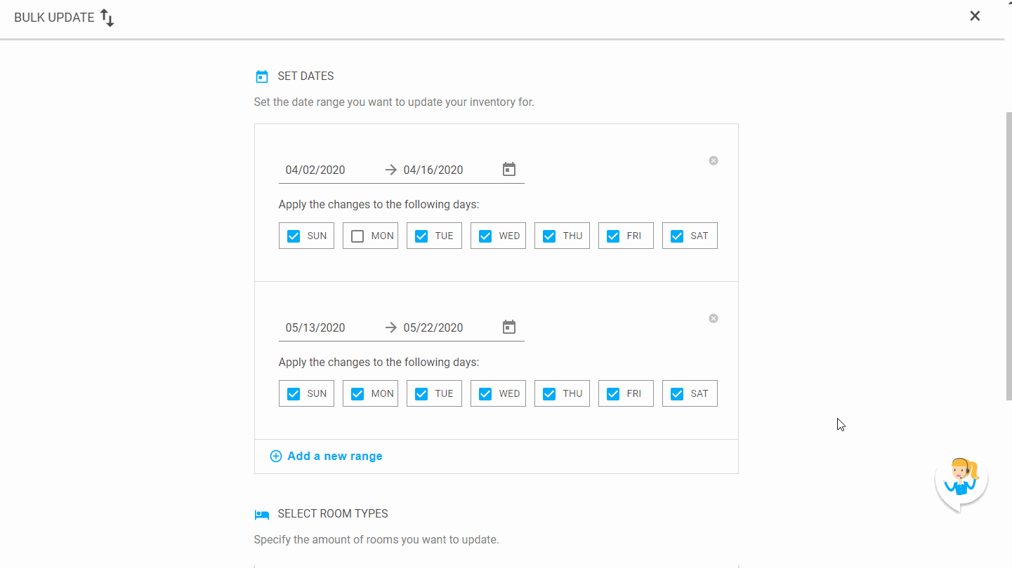 You can update your inventory by selecting the range of dates up to a year and a half. You can also deselect specific days of the week.
